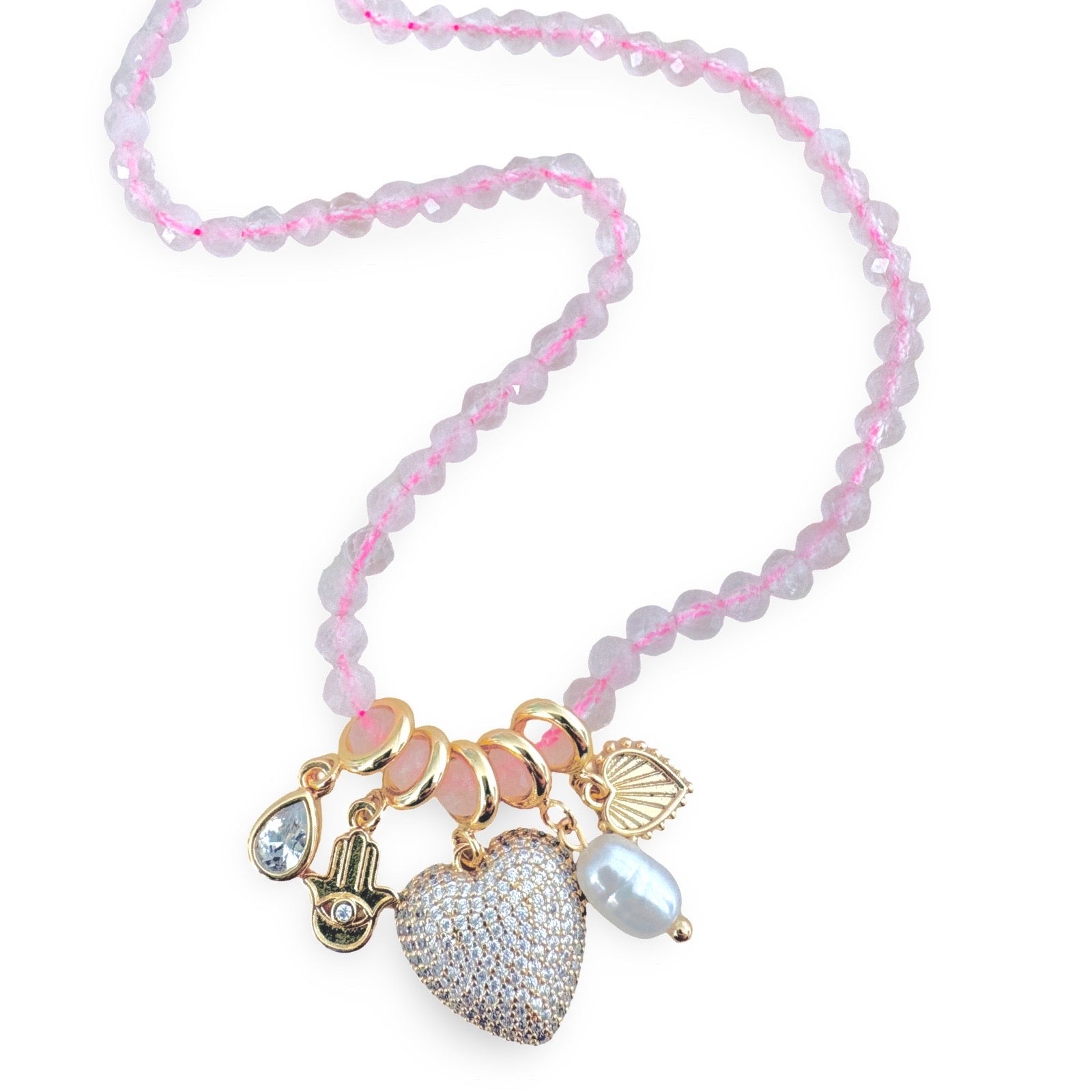 Natural faceted rose Quartz necklaces. 14k gold plated charms with cubic zirconia. Length: 16 inches + 2 inch extender.
